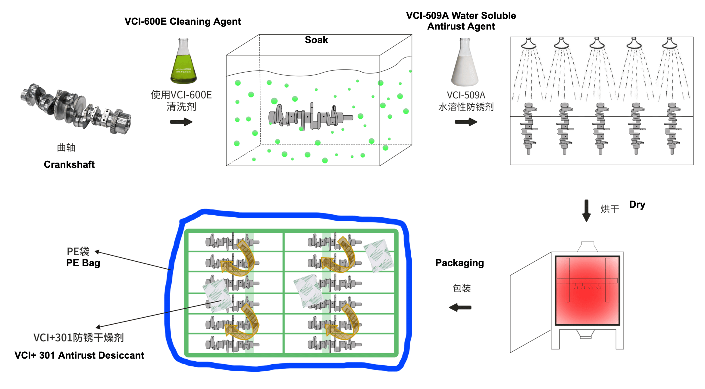 4. Coloque dessecantes antiferrugem VCI-301 nos sacos PE do virabrequim.